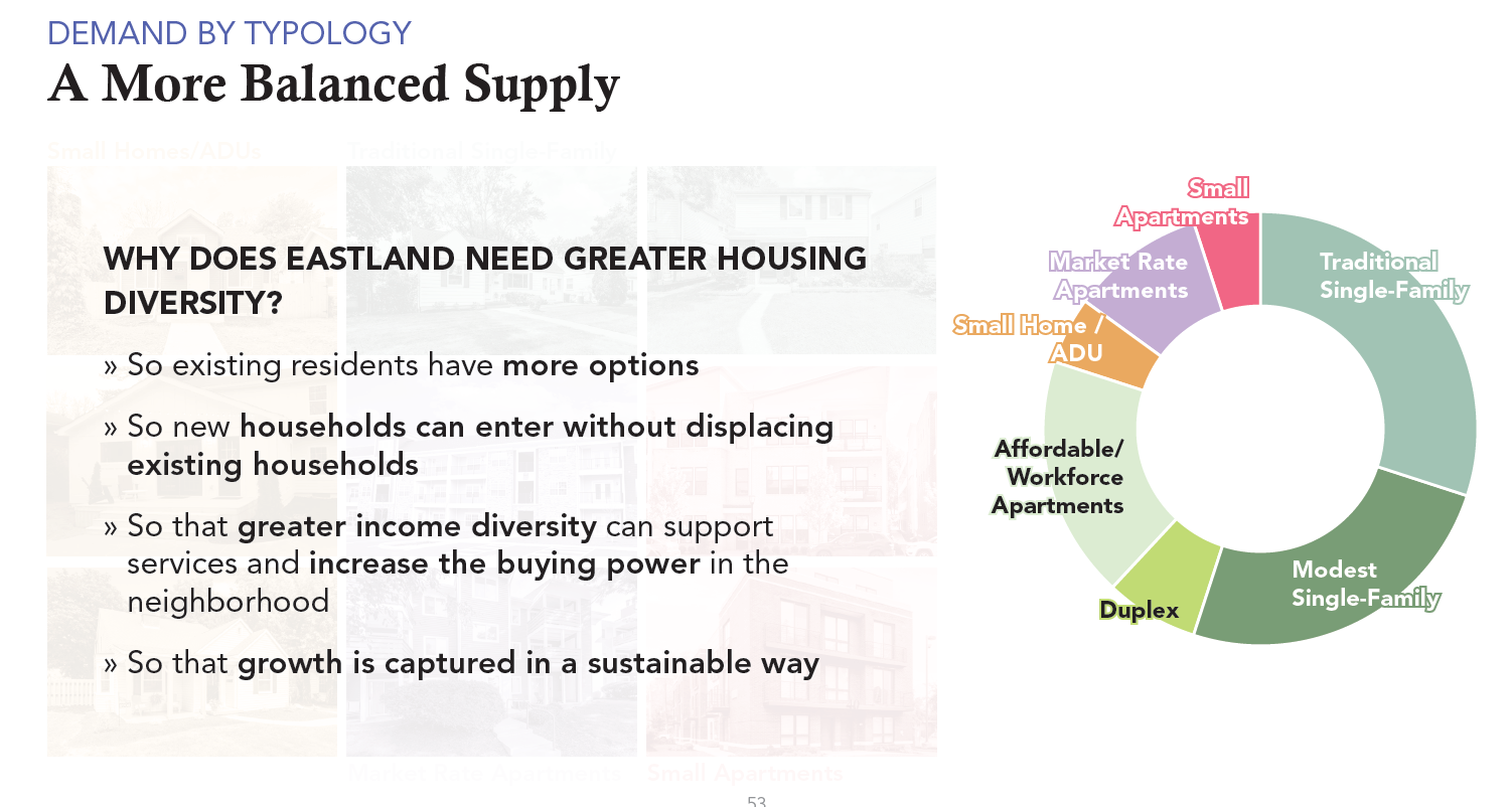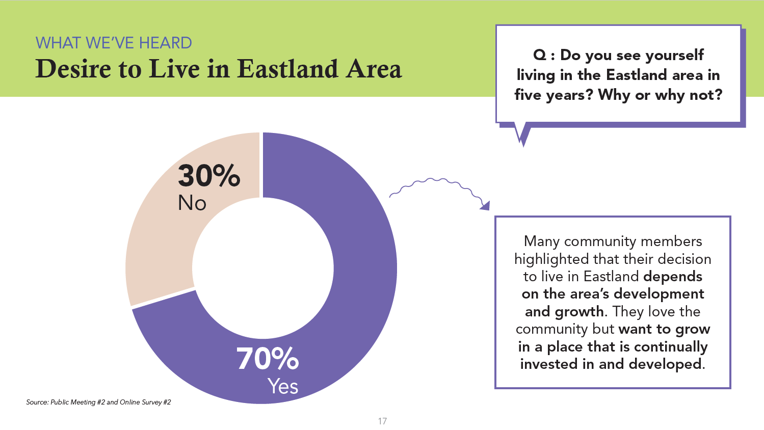 First, we explored feedback the community provided on the current state of housing and needs—missing community services, general desire to live in the Eastland area, and where new housing should go if developed in Eastland. These previously collected insights allow us to generally understand existing community desires and what strategies and resources the community feels are necessary to address the findings.