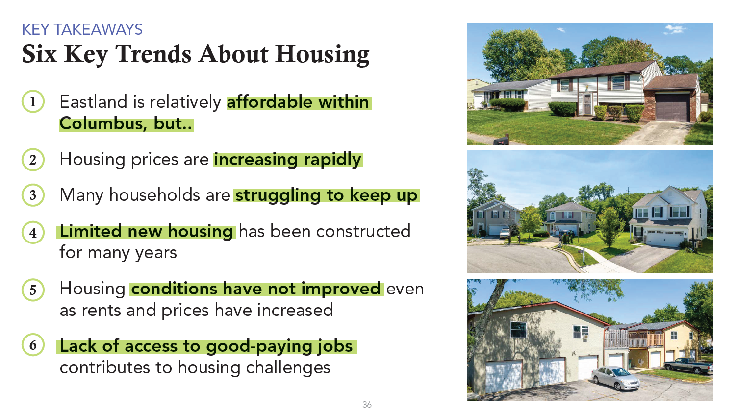 Slide highlighting the six key trends found in relation to housing in the Eastland study area