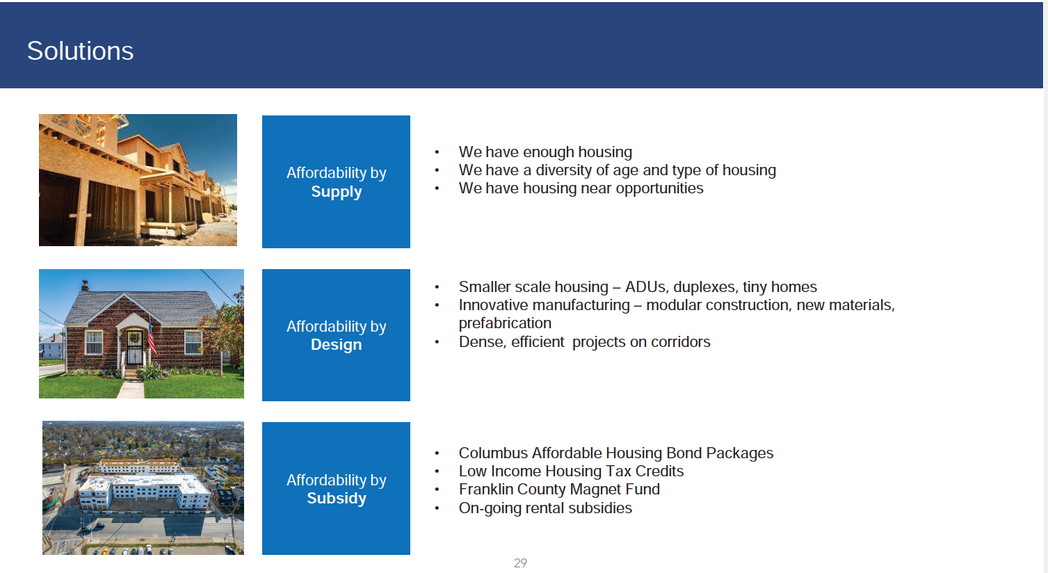 Next, the community heard from Erin Prosser, Deputy Director of Housing Strategies for the City of Columbus. Erin shared about the Columbus Housing Strategy that aims to develop housing infrastructure to address our housing shortage, and its impacts on our community.