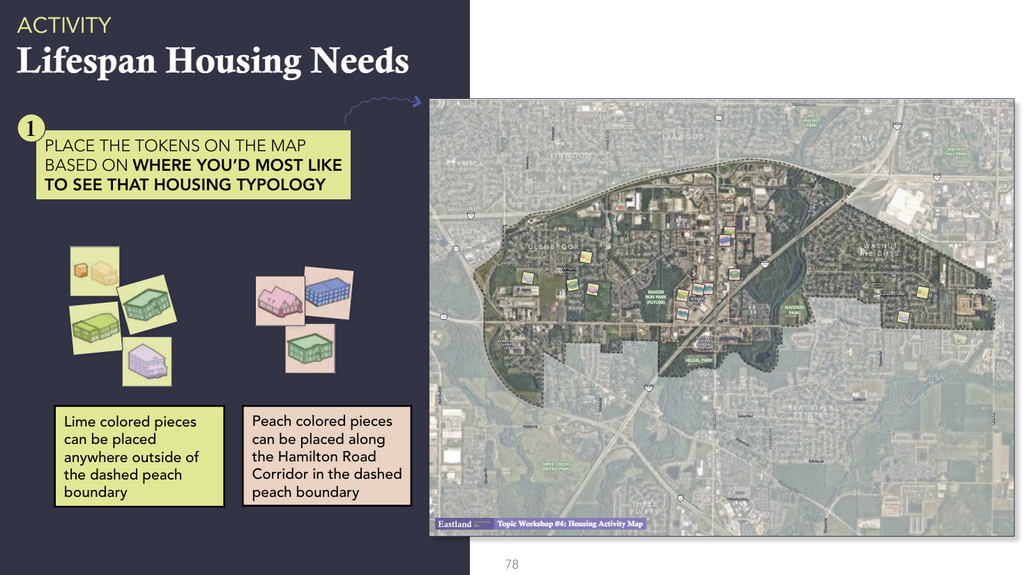 The second activity asked the community to map where they’d most like to see various housing typologies in the Eastland area.