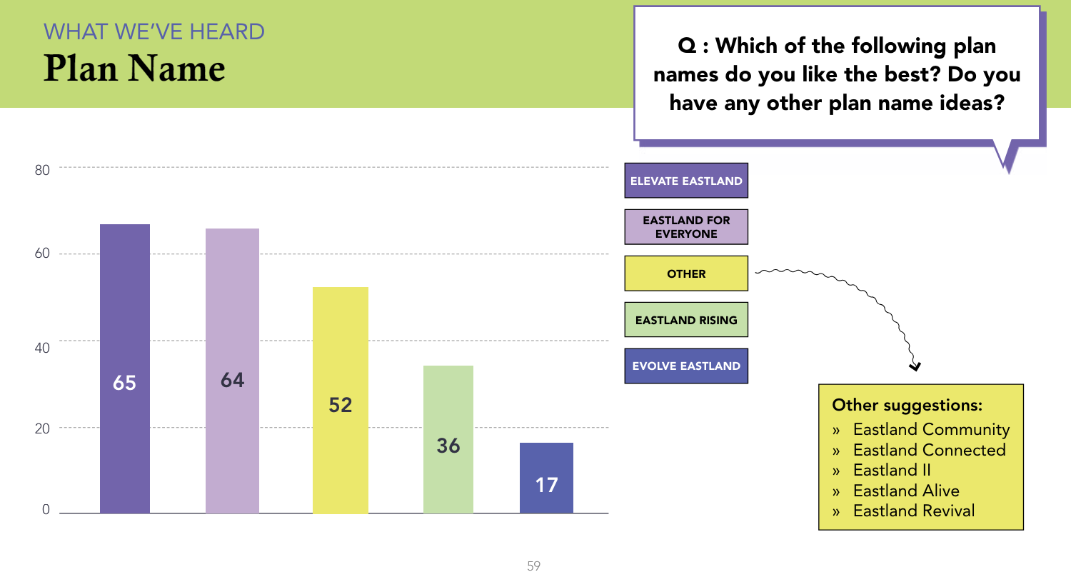 Next, the community discussed the existing need for a unifying identify and strengthened community pride in the Eastland area. With emphasis on illustrating community assets, we asked the community where the gaps existed and discussed what elements would help the community feel more unified. We also shared results from the survey on what the formal name of the Eastland Community Plan should be.