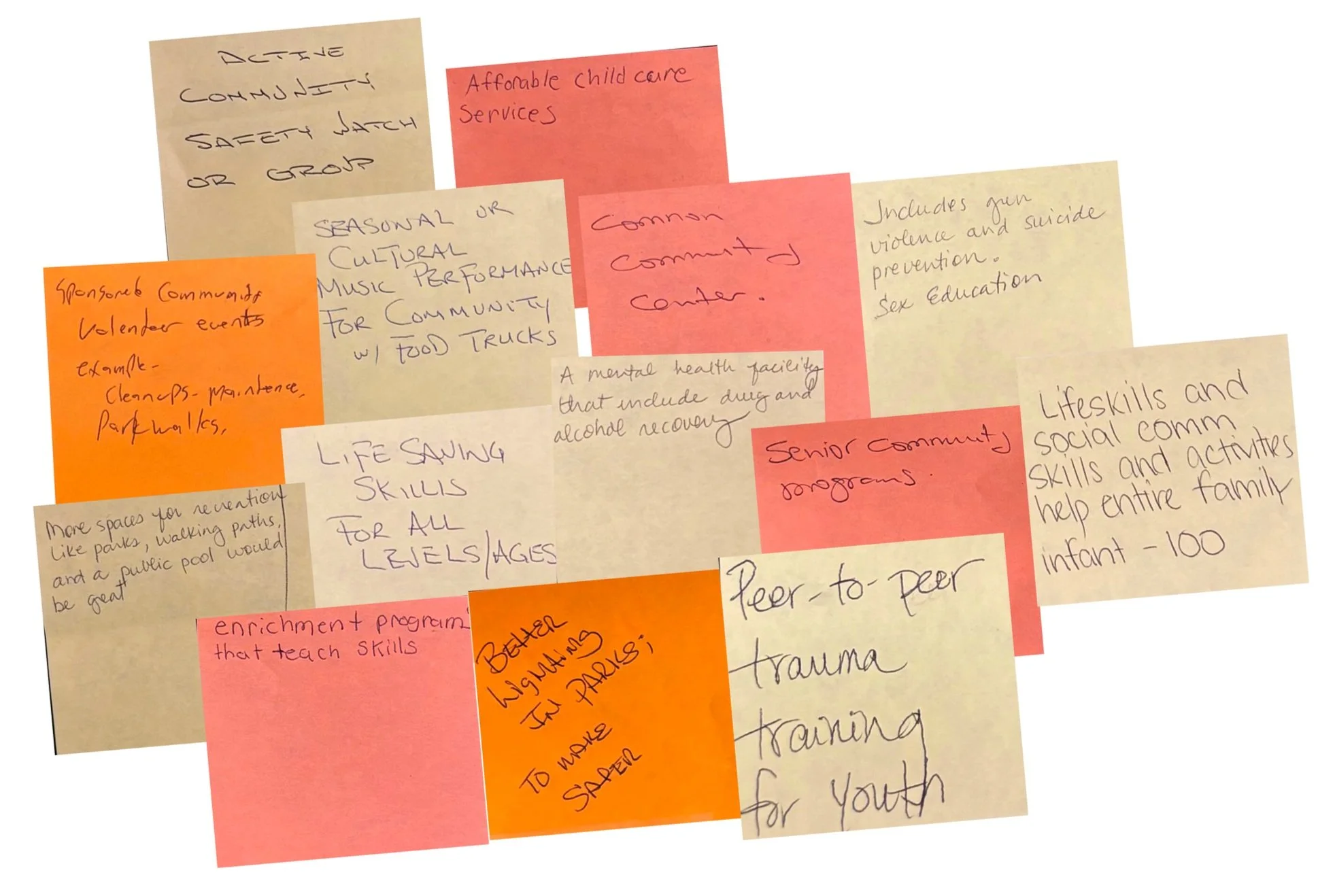 During the community well-being engagement activity, we asked the community to suggest tools, programs, or interventions that community partners and stakeholders could implement to address challenges and needs.