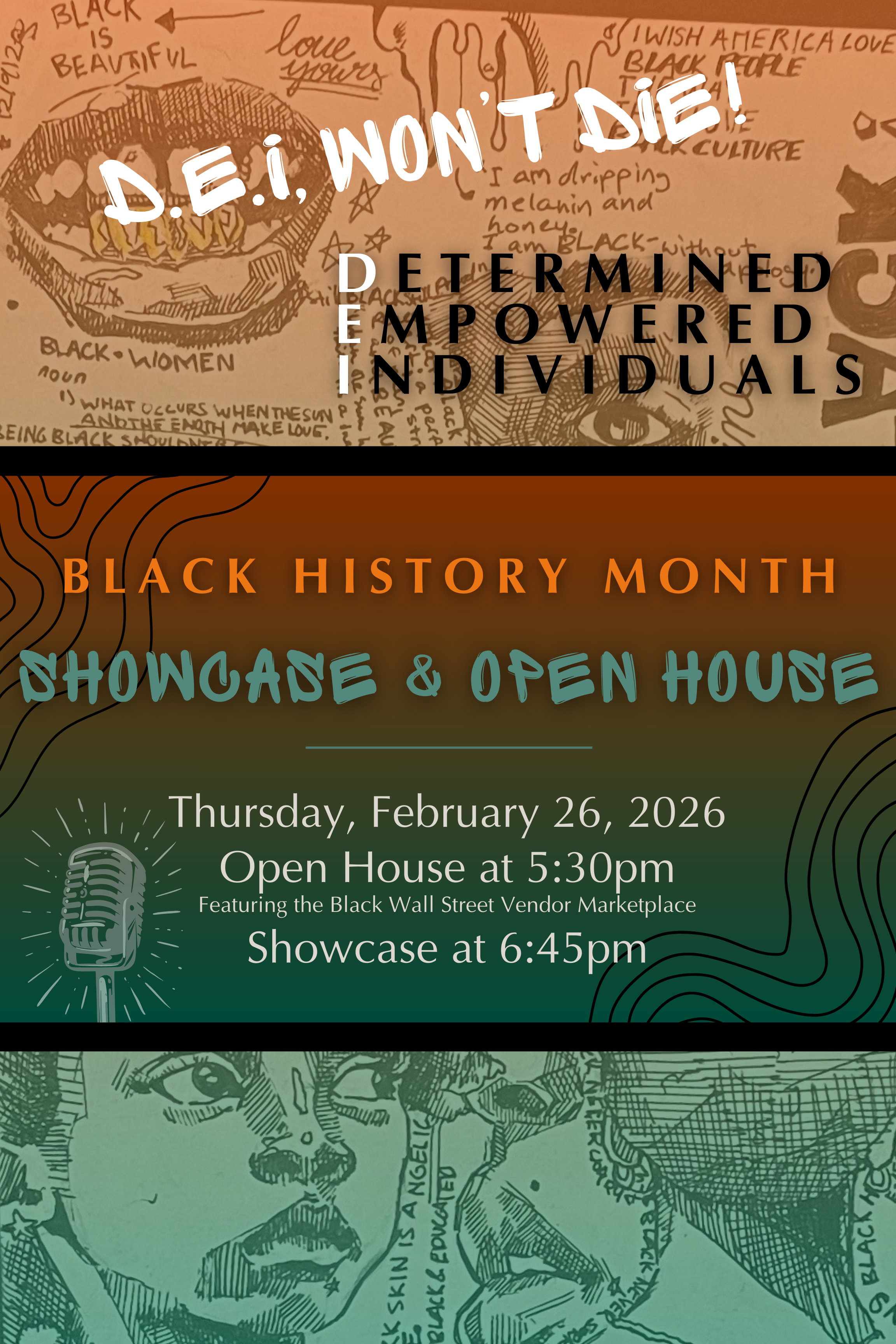 At 6:45 PM, enjoy our Black History Month Showcase, highlighting a variety of student performances and works that celebrate Black culture, creativity, history, and resilience.
