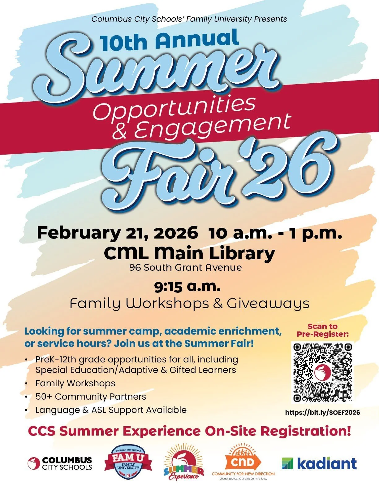 Family workshops and giveaways begin at 9:15 a.m. and the Summer Opportunities & Engagement Fair runs from 10 a.m.-1 p.m. at CML Main Branch.