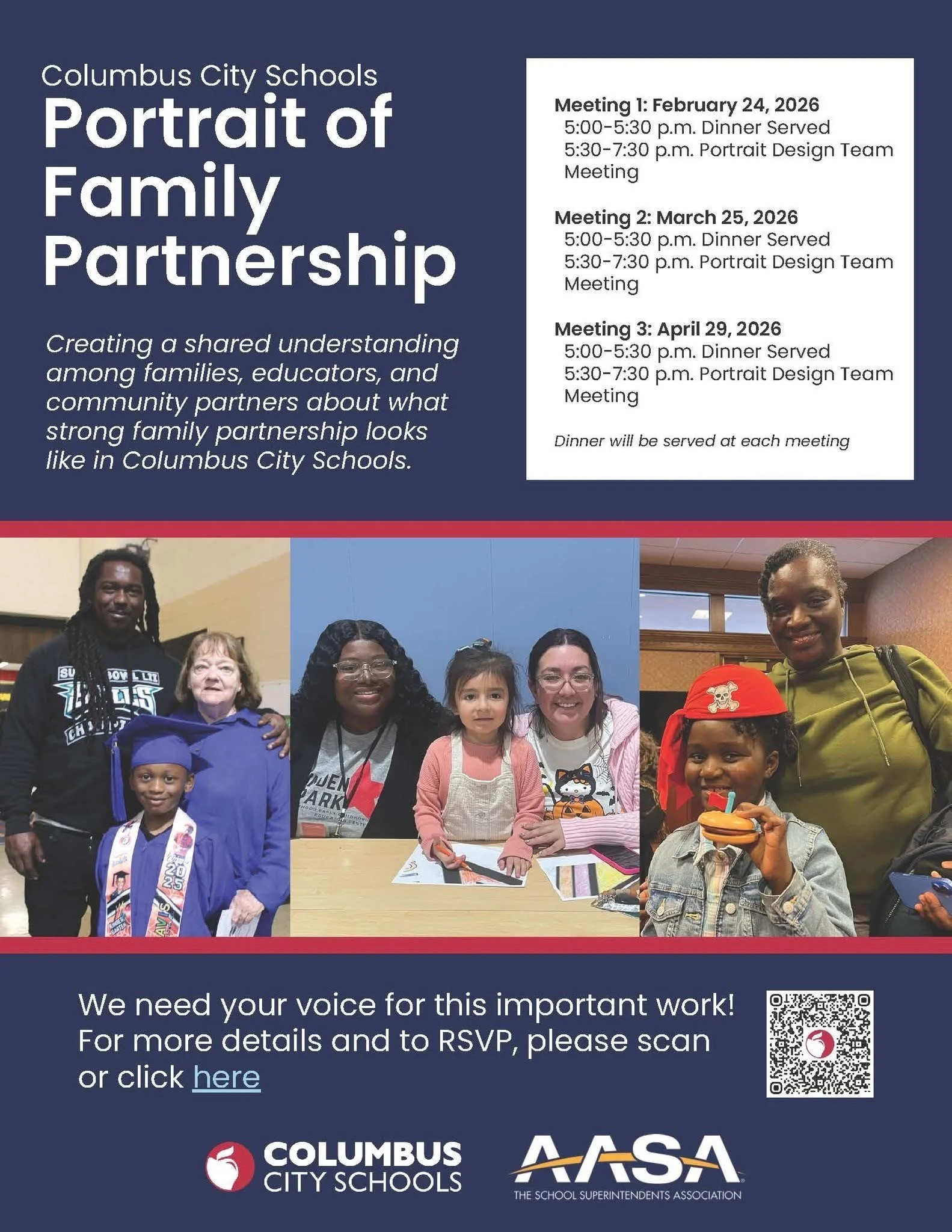 Columbus City Schools: Portrait of a Family Partnership Wednesday, March 25, 2026 5:00 PM 7:30 PM Google Calendar ICS We're on a mission to create a shared understanding of what strong family partnership looks like in CCS. You're invited along that journey. Join us and share ongoing input, and together inform our Portrait of Family Partnership.RSVP here: https://tinyurl.com/ykhykn29