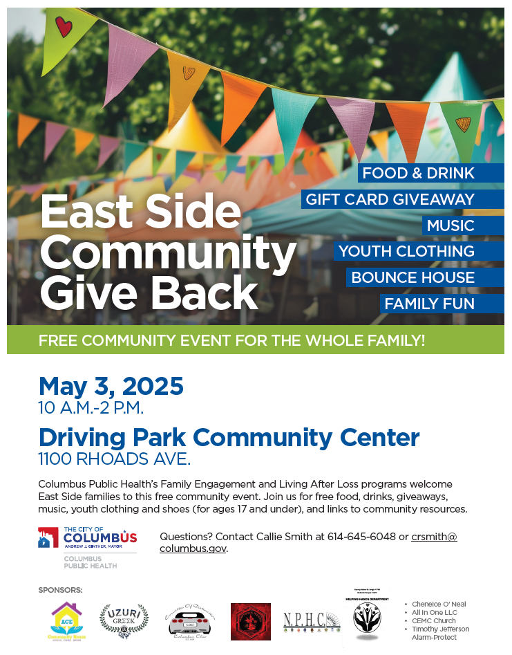 Columbus Public Health’s Family Engagement and Living After Loss programs welcome East Side families to this free community event. Join us for free food, drinks, giveaways, music, youth clothing and shoes (for ages 17 and under), and links to community resources.