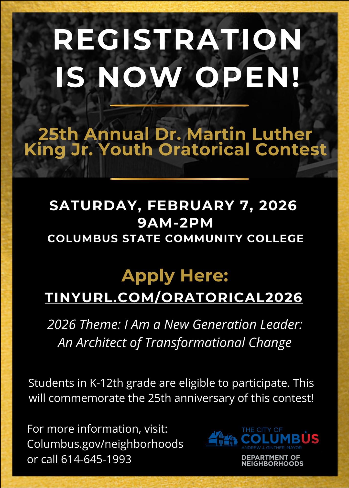 Registration NOW OPEN! Students in grades K–12 are invited to participate in the 25th Annual Dr. Martin Luther King Jr. Youth Oratorical Contest on Saturday, February 7, 2026, from 9 a.m.–2 p.m. at Columbus State Community College. This citywide celebration encourages young voices to share original speeches inspired by the theme, “I Am a New Generation Leader: An Architect of Transformational Change.”