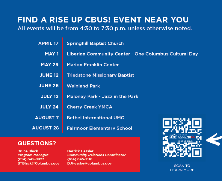 We're taking community pride to a whole new level! Join us for a Rise Up CBUS! event near you. Learn about resources from city and community partners. Enjoy free food, music and connect with your neighbors. Admission is free.