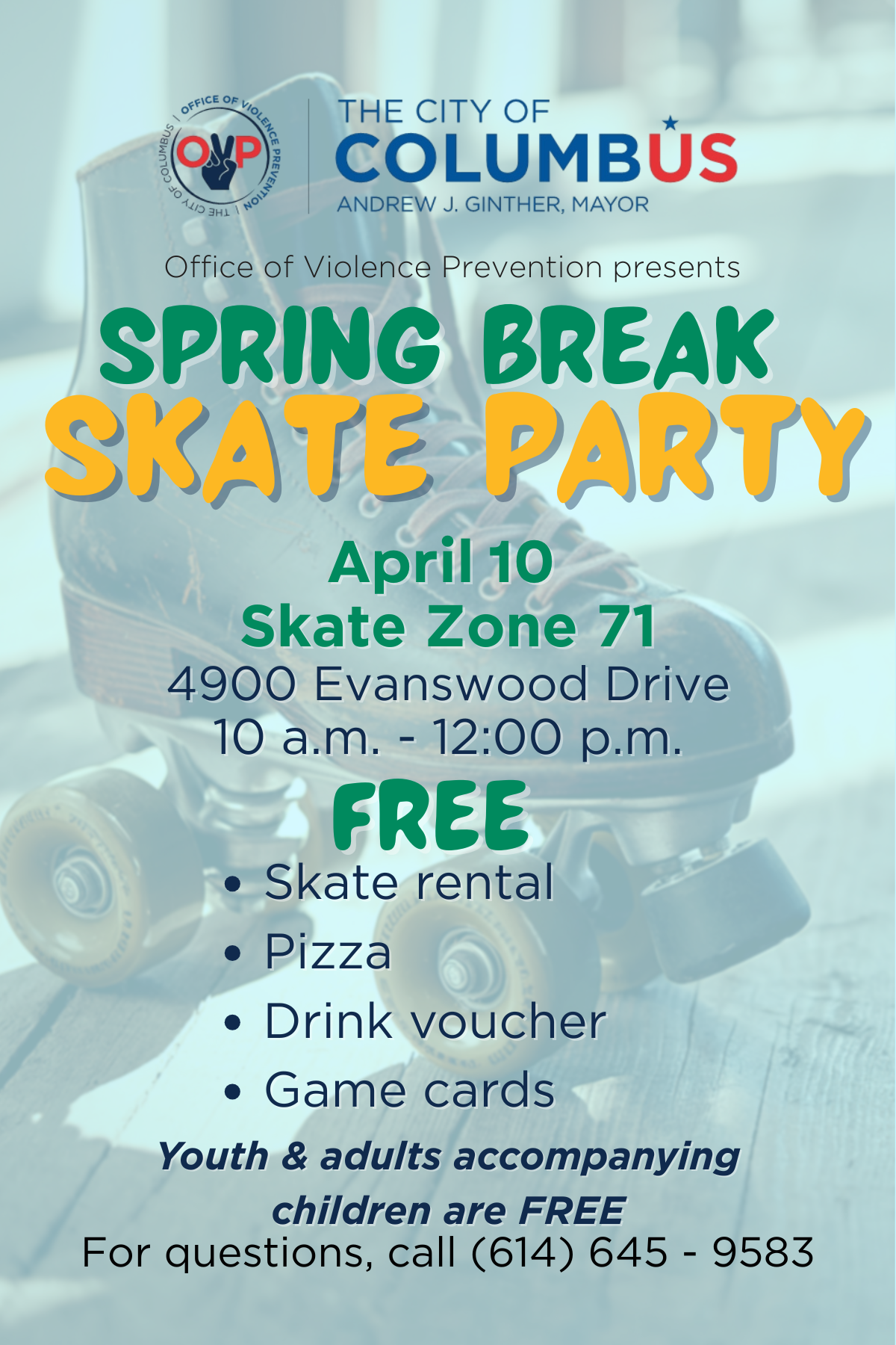 Back to All Events Spring Break Skate Party Friday, April 10, 2026 10:00 AM 12:00 PM Skate Zone 71 4900 Evanswood Drive Columbus, OH, 43229 United States (map) Google Calendar ICS