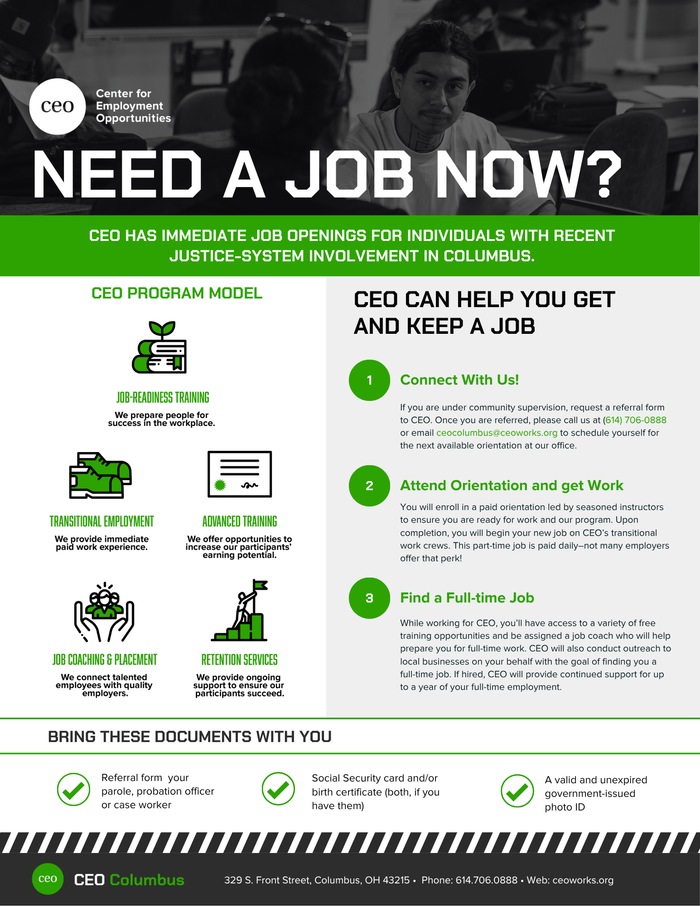 CEO, the Center for Employment Opportunities, can help you get and keep a job. Offering job-readiness training, transitional employment, advanced training, job coaching and placement, and retention services.